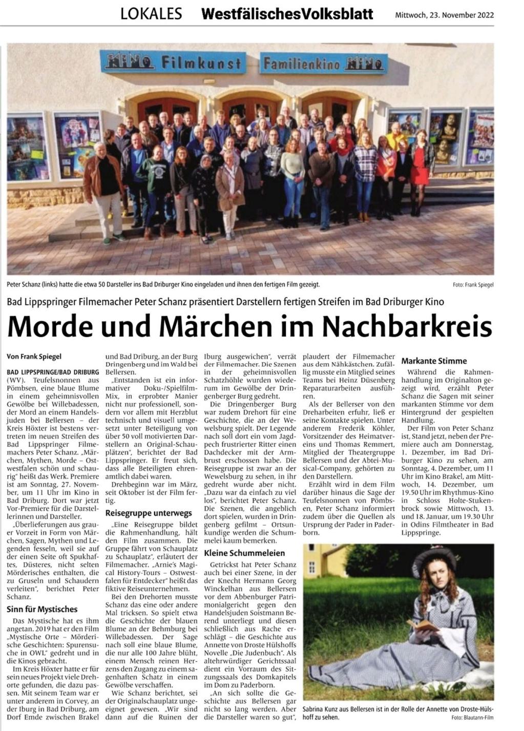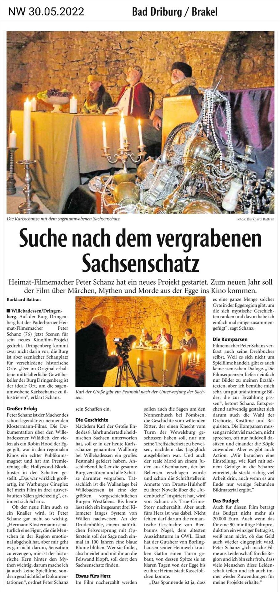 Zum dritten Mal vergab Westfalen Weser (WW) den WWKulturpreis und leistet damit einen wertvollen Beitrag zur Förderung der Kulturszene in der Region. Im stimmungsvollen Ambiente der Abtei Marienmünster wurden am 29. August die diesjährigen Preisträger in Filmbeiträgen persönlich vorgestellt und geehrt – so auch „Peter Schanz, Filmemacher“, der auf diesem Wege der hochkarätig besetzten Jury, Westfalen-Weser und dem Rat der Stadt Bad Lippspringe (Nominierung) dankt.